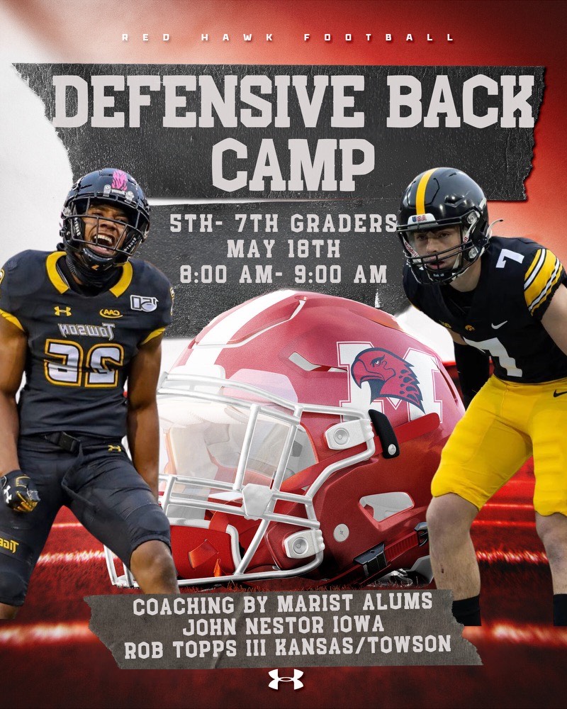 Marist Football will be hosting an defensive back football camp for current 5th, 6th, and 7th graders at the Larry Tucker Marist SportsPlex on Saturday, May 18th from 8-9am. Get a chance to work with 2 Marist Alums John Nestor and Rob Topps. John currently plays for University of Iowa and Rob Topps played at Kansas and Towson State University . The Marist SportsPlex is located at 12221 S. Ridgeland Avenue in Palos Heights. The camp will work on football specific speed and agility. Campers should bring football cleats and a water bottle to the camp. Camp will be from 8-9am.