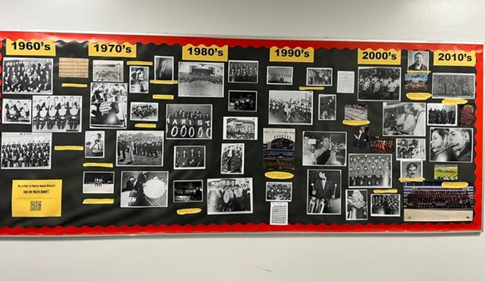 We have made progress on our Marist Band Timeline bulletin board! Please see the picture below: