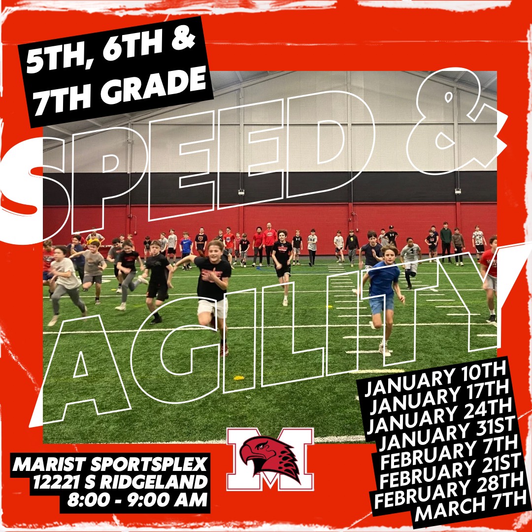 Marist Football will be hosting speed and agility football camps for current 5th, 6th, and 7th graders at the Larry Tucker Marist SportsPlex on Saturday mornings throughout January, February, and March (See dates below). The Marist SportsPlex is located at 12221 S. Ridgeland Avenue in Palos Heights. The camp will work on acceleration, deceleration, max velocity, change of direction, and agility. Campers should bring football cleats and a water bottle to the camp. Camp will be from 8-9am.