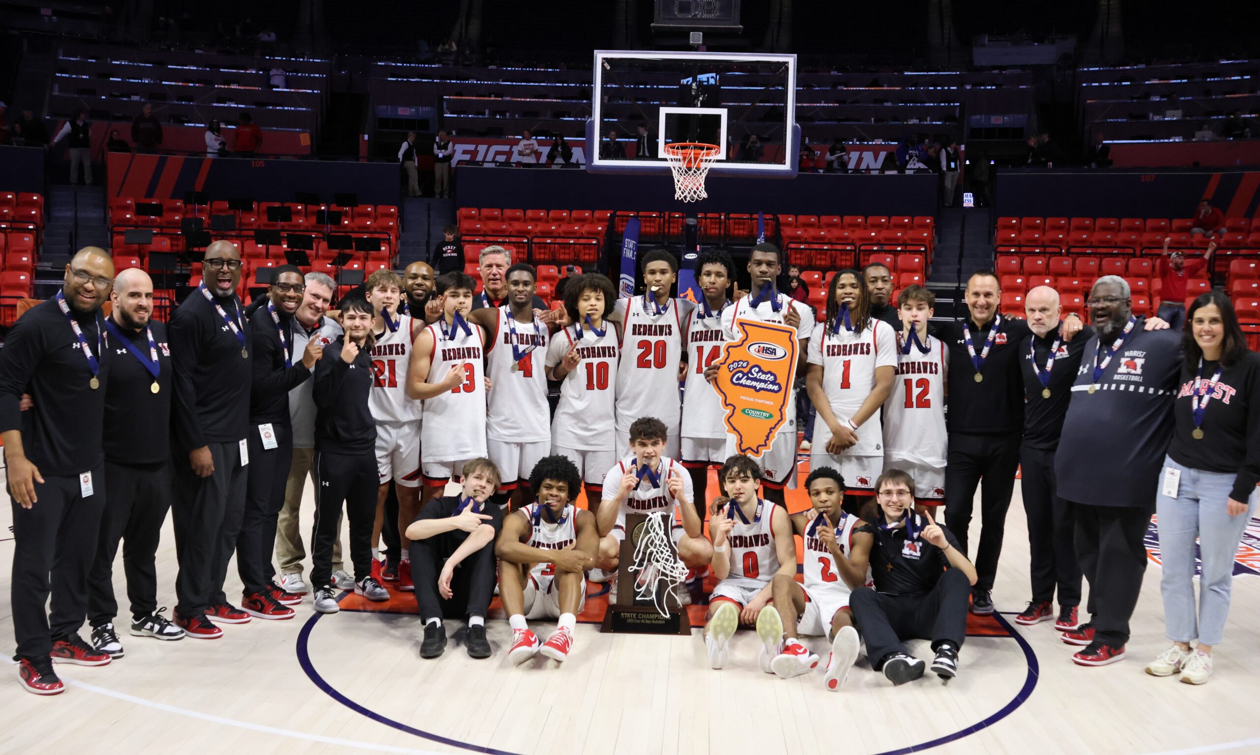 CHICAGO — The 2025–26 Marist Boys Basketball team capped off a historic 33–5 season by defeating ESCC rival and nationally ranked Benet Academy, 44–28, to claim the IHSA 4A State Championship.