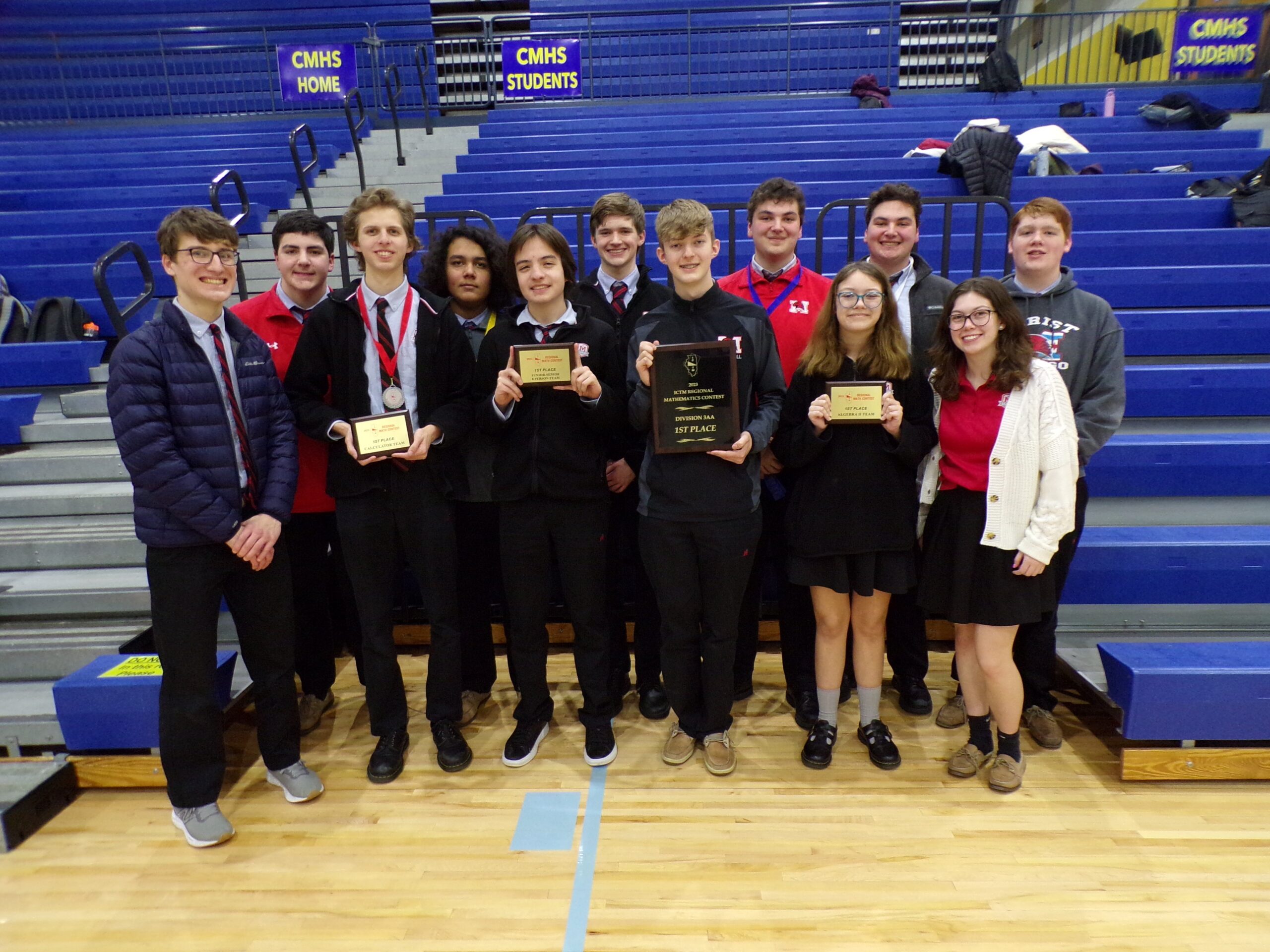 At the Regional Math Competition held at Crete-Monee High School, we finished in 1st overall qualifying for the State Finals. We took first in the following competitions: Algebra 1 team, Geometry team, Algebra 2 team, Pre-Calculus team, Frosh-Soph 8-person, Junior-Senior 8-person, Calculator team, Frosh-Soph 2-person, and Junior-Senior 2-person. Individual first place winners were: freshmen Ryan Deskovich and Hailey Dostal, sophomores Celia Lindokken and Nathan Angelo San Gabriel, junior Michael Alfano, and seniors Dominic Heidorn and Moira McKee. Seniors Alex Larson and Moira McKee took 2nd in the Oral competition.
